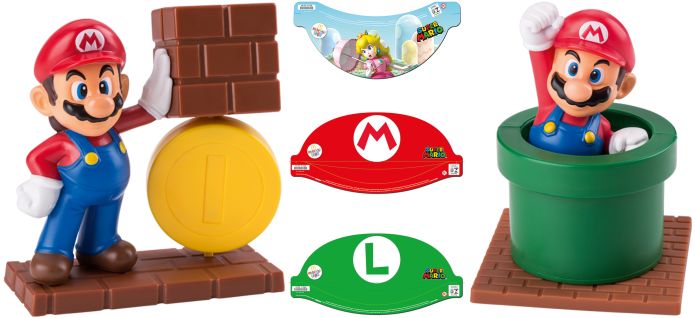 São três variações de Mario, um Lugi, um Donkey Kong, um Toad, um Cogumelo, uma Princesa Peach e um Yoshi como opções de brindes junto com o sanduíche focado no público infantil. Você também pode ganhar uma viseira ou do Mario, ou do Luigi ou da Princesa Peach.