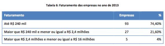 A maioria das empresas tem cinco anos de existência, um tempo considerado curto. O faturamento gira em torno de 240 mil reais, realidade de pelo menos 93 das companhias, ou de 74,4% do mercado.
