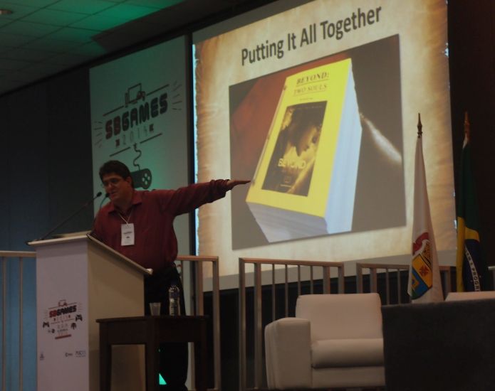 Palestra do Richard Dansky, que fez roteiros para Tom Clancy’s Rainbow Six e até para Splinter Cell. Conversamos com ele após a palestra.