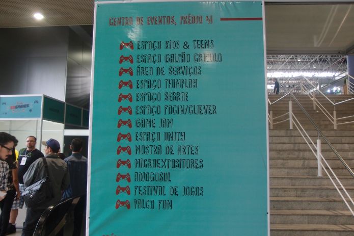 Na lateral esquerda da entrada, é possível ver parte da programação do evento, que ocorre em salas distintas.