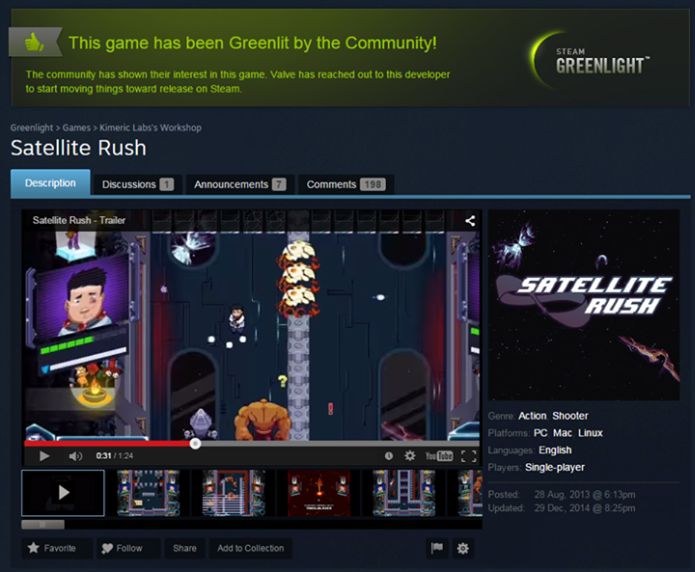 O jogo Satellite Rush, da empresa carioca Kimeric Labs, foi aprovado no sistema Greenlight no dia 2 de janeiro e será lançado no Steam ao longo de 2015. O jogo é um shooter que funcionará em PCs Windows, Mac e Linux para apenas um jogador.