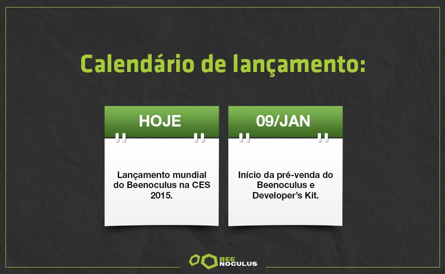 O aparelho entrará em pré-venda a partir do dia 9 de janeiro por cerca de R$ 99. O preço é bem mais atraente do que o Oculus Rift, que custa em média US$ 350 (R$ 945 sem impostos), e agora foi lançado em sua versão Crescent Bay. Na mesma feira americana, a Razer anunciou seus óculos Android OSVR, open source, por US$ 199 (R$ 537), preço similar ao Gear VR. Kits especiais de desenvolvimento do Beenoculus saem por R$ 500.