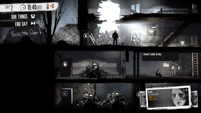 Esse jogo, criado por um estúdio polonês, é uma simulação de guerra, mas não um jogo de tiro. Seu objetivo como jogador é manter um grupo de civis vivo durante uma guerra. Basta algumas horas de jogo para você começar a questionar certo e errado. Será que vale a pena deixar essa pessoa se juntar ao meu grupo? Ela tem habilidades que vão ser valiosas ou será apenas mais uma boca para alimentar? Roubo os mantimentos desse outro grupo de sobreviventes ou procuro em outro lugar? Mas um dos meus sobreviventes está doente e eles parecem desarmados…