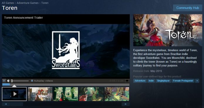 Toren, game da gaúcha Swordtales aprovado pela Lei Rouanet e em desenvolvimento há quatro anos, chega em maio no Steam. Geração Gamer antecipou, em entrevista com os criadores, que o jogo poderia chegar entre fevereiro e abril deste ano. O game brasileiro ainda pode ser antecipado em outras plataformas. A página no Steam foi localizada hoje. O jogo conta com o trabalho da publisher Versus Evil, de Banner Saga.