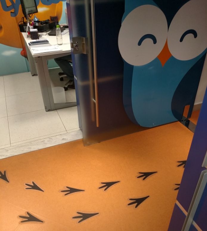A empresa, internamente, tem corujas desenhadas por toda parte.