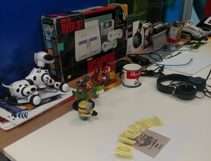 O pessoal tem consoles antigos no escritório, e vários bonequinhos.