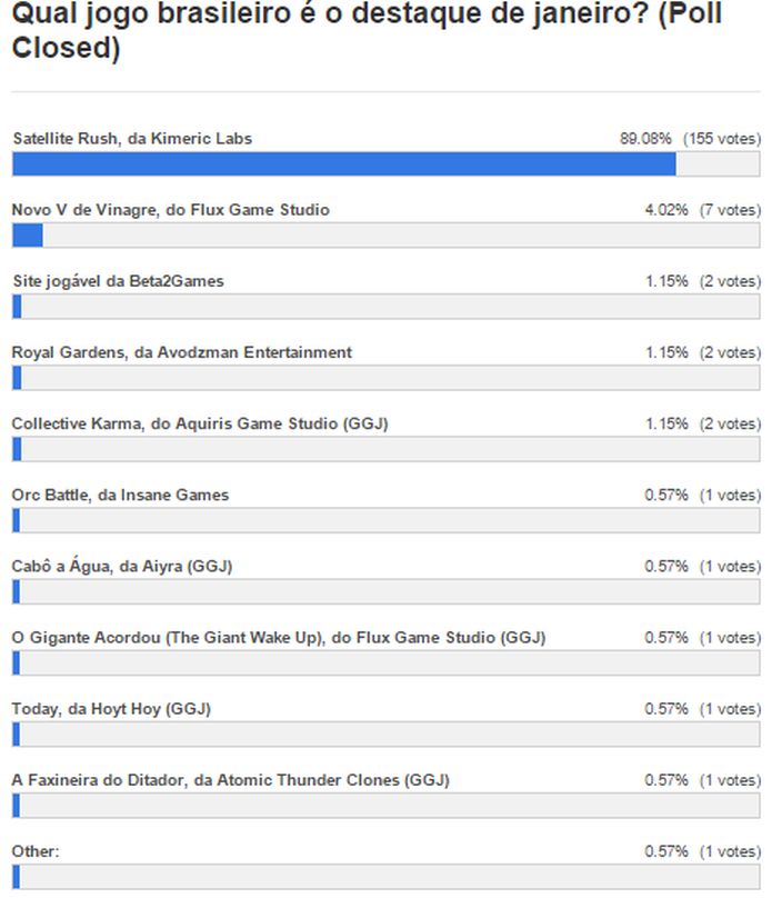O site Geração Gamer realizou sua enquete para definir o game de destaque do mês de janeiro. Faremos questionamentos mensais e anuais para eleger os jogos brasileiros mais interessantes ao público em nosso site. O título com mais votos foi Satellite Rush, desenvolvido pela Kimeric Labs.