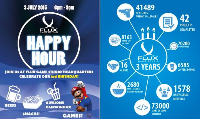 O estúdio paulistano Flux, chefiado por Paulo Luis Santos, que também é integrante da ABRAGAMES, celebrou três anos de história com uma nova mudança em seu logotipo, uma festa em sua sede na Vila Madalena e divulgando dados sobre a empresa. Comparecemos na confraternização, que ocorreu na época do BIG Festival numa noite do dia 3 de julho a luz de velas por uma queda de energia. Foi um encontro agradável e com desenvolvedores de todas as partes do Brasil, do Amazonas até gente do Rio de Janeiro.