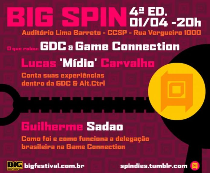 O encontro BIG SPIN, que reúne palestras focadas para desenvolvedores de games em São Paulo, ocorrerá no dia 1º de abril, uma quarta-feira, no Centro Cultural de São Paulo, ao lado da estação Vergueiro de metrô. E isso não é pagadinha.